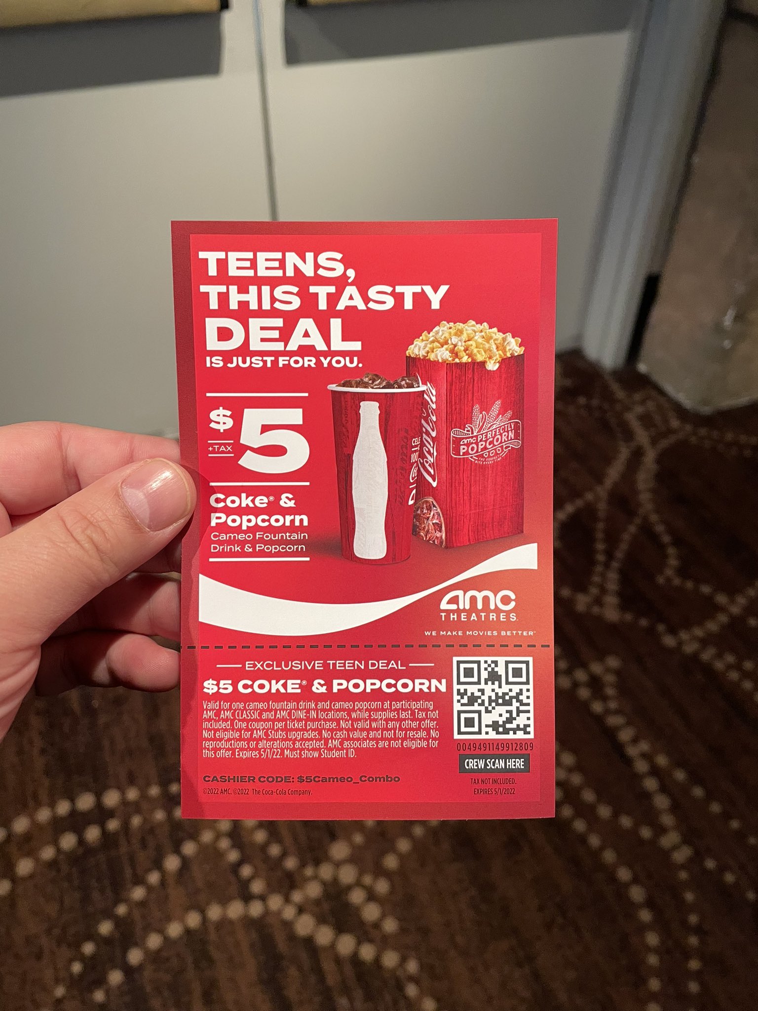 AMC Theatres: $5 Cameo Popcorn & Fountain Drink Combo for Teens ... AMC Theatres: $5 Cameo Popcorn & Fountain Drink Combo for Teens (Student ID required) Valid for one cameo fountain drink and cameo popcorn at participating AMC, AMC CLASSIC and AMC DINE-IN locations, while supplies last. Tax not included. One coupon per ticket purchase. Not valid with any other offer.